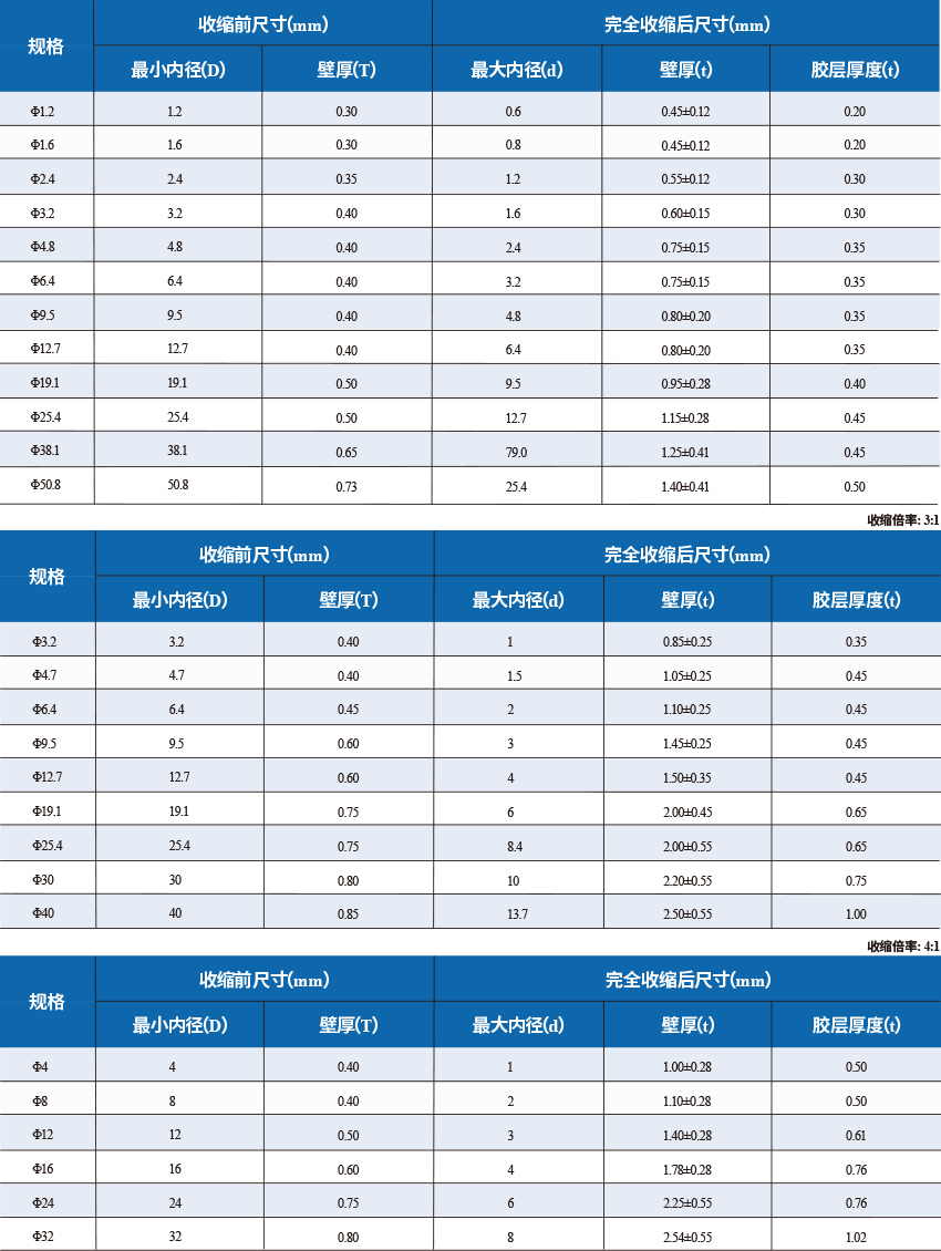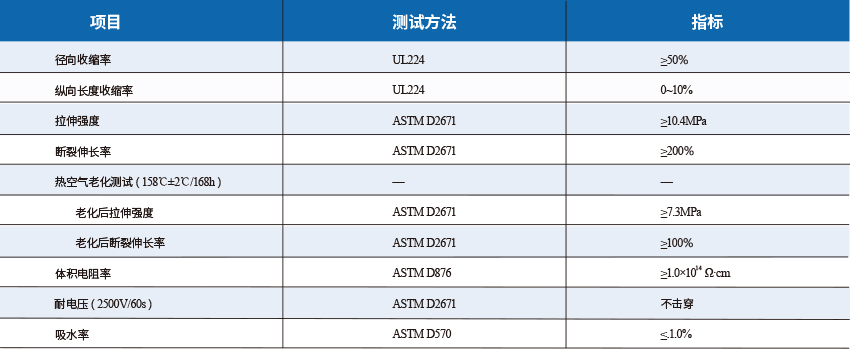 ◆ 柔軟、無鹵阻燃、環保 ◆ 優異的防水、防潮性能 ◆ 收縮溫度:100℃~120℃ ◆ 工作溫度:-40℃~125℃ ◆ 滿足UL 224標準(認證號: E180908)